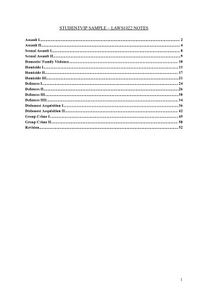 I achieved a HD with these full course notes. They include all theoretical content for the essay component + all offence elements/steps for the problem question. I hope these notes help :) They are comprehensive and include all topics studied, including: - Assault (common assault, aggravated assault) - Homicide (murder, constructive murder, manslaughter, homicide by omission, assault causing death, supply of drugs causing death) - Defences (mental health and cognitive impairment, substantial impairment, intoxication, self-defence, excessive self-defence, extreme provocation) - Dishonest acquisition (dishonesty and fraud, larceny) - Group crime (complicity - JCE; EJCE; accessorial liability, conspiracy) - Revision content
