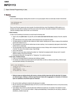 Detailed description of advanced topics taught in this course, with code blocks as examples. Achieved a mark > 90% in the exam after writing these. It's a difficult course but these notes will certainly help you to succeed. Topics: Java Basics Conditionals, Loops & Recursion Data Structures Input & Output OOP (Interfaces, Abstract Classes, Generics, Wildcards, Anonymous Classes) Gradle & Miscallaneous