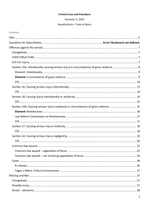 TIPS: 5 Offences against the person 7 Chargebook 7 HYPO STRUCTURE 7 S15 CA: Injury 7 Section 15A: Intentionally causing serious injury in circumstances of gross violence 8 Element: Intentionally 9 Element: Circumstances of gross violence 9 STS 10 Section 16: Causing serious injury intentionally. 13 STS 13 Section 18: Causing injury intentionally or recklessly. 14 STS 15 Section 15B: Causing serious injury recklessly in circumstances of gross violence. 15 Element: Recklessness 16 Law Reform Commission on Recklessness: 17 STS 17 Section 17: Causing serious injury recklessly. 18 STS 18 Section 24: Causing serious injury negligently. 19 STS 20 Common law assault 22 Common law assault – application of force: 22 Common law assault – not involving application of force: 24 Cases 26 R v Brown 26 Fagan v Metro. Police Commissioner 27 Policing and Bail 27 Chargebook 27 Possible essay 27 Arrest – elements 28 Legislative requirements. 28 Reasonable Grounds v Belief – s459 29 Reasonable grounds objectively assessed. 29 Use of force [bulk of analysis] 30 Arrest at common law 30 1 - Deprivation of liberty – Requirement 1 31 2 - Informed of arrest – Requirement 2 31 3 - Informed of the reason for the arrest – Requirement 3 31 What does it matter if an arrest is unlawful 31 Police Questioning 31 Police questioning - STS 33 Good policy essay: extent to which Victim’s attitude to prosecution should be given weighting. 33 Bail - Impacts 34 Bail determination 34 Step 1 – determination 34 Step - Bail – Aboriginal People 35 Step 2 - Surrounding circumstances – bail 35 Application of the bail act to certain crimes 36 Flowchart – which test applies? 36 Police Custody 38 Police questioning (s464A): 38 Arrest Hypo Template 39 STS – elements 40 Questioning – Flowchart 41 Bail – Flowchart 42 Murder 42 Chargebook 42 HYPO STRUCTURE 42 For homicide – a living human must be killed. 43 Homicide Offences: 43 Elements: Intentional/Reckless murder 44 Element 1: Causation 44 Element 2: Conscious, voluntary and deliberate 48 Element 3: intention or recklessness 48 STS 50 Intentional or Reckless Murder at Common Law 50 S3a – Punishment for Murder 58 Manslaughter 59 Chargebook 59 HYPO STRUCTURE 59 Introduction 60 Elements – UNLAWFUL act manslaughter 60 Elements - DANGEROUS act manslaughter 60 First element: Causation 60 Second element: Voluntariness 60 Third element: Unlawfulness 60 Fourth element: Dangerousness 61 STS 62 Manslaughter 62 s5 CA: Punishment of Manslaughter 66 s4A CA: Manslaughter—single punch or strike taken to be dangerous act 66 ‘One-Punch’ Manslaughter 67 Negligent Manslaughter 67 Chargebook 67 HYPO STRUCTURE 67 Introduction 68 Elements 68 Element 1: Duty of care 69 Element 2: Criminal Negligence 71 Element 3: Voluntariness 73 Element 4: Causation 74 STS 74 Negligent Manslaughter 74 s5 CA: Punishment of Manslaughter 84 Property Offences 84 Chargebook 84 HYPO STRUCTURE 85 Introduction 85 Theft Elements 85 Element 1a: property 86 Element 1b: Property belonging to another 86 Element 2: Appropriation 87 Element 3: intention to permanently deprive 90 Element 4: Dishonesty 92 Robbery 94 Elements 94 Element 2: does not need to have been the victim of theft that the force was used on. 95 Armed Robbery 96 Elements 97 Defences 98 Chargebook 98 Overview of defences 98 Duress 99 Elements: 100 Sudden or extraordinary emergency 105 Elements 106 Self-defence 108 Elements: 108 Family violence – relevant to self-defence/duress 113 Relevance to self-defence 114 Relevance to duress 114 Mental Impairment and Intoxication 115 Chargebook 115 Possible essay 115 Fitness to Stand Trial 115 Test – Section 116 Mental Impairment Defence 117 Hypo elements 118 Crime and intoxication 122 Intention 123 Voluntariness/means rea - Dutch Courage 124 Recklessness/intention (mens rea) – Knowledge/Awareness/Foresight 124 Intoxication re defences 124 Sexual offences 126 Consent 129 Rape (s38) 130 Compelled Rape (s39) 136 Sexual assault (s40) 137 Sexual assault by compelled sexual touching (s41) 139 Essay topics 140 Joint Liability 145 Chargebook 145 Hypo Steps: 145 Elements - s323(1)(a) ONLY OFFENCE IS PRIMARY OFFENCE 146 Elements – s323(1)(b) TWO OFFENCES – ORGANISED ONE, BUT ACTUALLY DID THE OTHER 146 Assisting, encouraging and directing – statute 146 Assisting, encouraging and directing – CL 147 Assisting, encouraging and directing – Mental Element 147 S 323(1)(c) ONLY OFFENCE IS PRIMARY OFFENCE 148 S 323(1)(d) [UNLIKELY TO BE ASSESSED] TWO OFFENCES – ORGANISED ONE, BUT ACTUALLY DID THE OTHER 148 “Withdrawal” – Analysis 148 “Agreement” – Analysis 149 S323(1)(a) – (b) - hypothetical 150 Chargebook 151 KEY - Overview 151 KEY - Statutory Complicity (From 1/11/14) 153 Sentencing 163