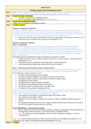 HD Evidence exam notes with exam script and concise case summaries. Topics covered: RELEVANCE COMPETENCE AND COMPELLABILITY PRIVILEGE EXAMINATION OF WITNESSES CREDIBILITY EVIDENCE CHARACTER EVIDENCE TENDENDY AND COINCIDENCE HEARSAY RIGHT TO SILENCE ADMISSIONS EVIDENCE OBTAINED IMPROPERLY OR ILLEGALLY OPINION