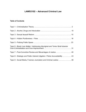 I used these notes to achieve a high distinction (86) in LAWS3102: Advanced Criminal Law. Comprehensive and detailed notes on all readings for the course. Extremely useful for the major and minor essays. Up to date and covers all topics including recent commentary on Covid-19 / BLM. Covers the following topics: - Criminalisation Theory - Alcohol, Drugs and Intoxication - Sexual Assault Reform - Hidden Punitiveness - Fines - Policing Public Space - Black Lives Matter / Addressing Aboriginal and Torres Strait Islander Over-Criminalisation and Over-Imprisonment - Post-Conviction Review and Miscarriages of Justice - Strategic and Public Interest Litigation / Police Accountability - Social Media, Forensic Journalism and Criminal Justice