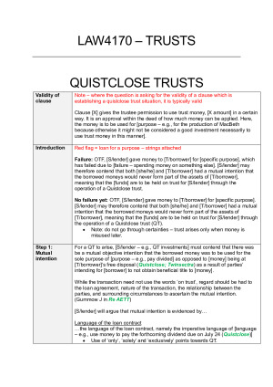 This comprehensive script helped me achieve a HD (89) for my exam and the overall unit! It condenses the overwhelming and complex content into simple, concise sentences for ease of use in stressful exam conditions. I have also incorporated examples to prompt speedier problem identification, following ideal tutorial answer outlines and CE exam answer guides. Most issues have been considered and integrated into these notes, however, may be subject to changes to the unit curriculum. TOPICS INCLUDED - Certainty of intention - Certainty of Subject Matter - Certainty of Objects - Quistclose Trusts - Charitable Trusts - Statutory Writing Formalities and Constitution - Duties and Powers of Trustees - Defences and Limitations on liability - Trustees' Rights - Beneficiary Rights - Remedies