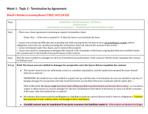 Detailed case summaries. Carefully curated throughout the semester and organised in accordance with the weekly reading list. These notes were my main study tool, so I put hours into compiling and optimising them into a format which makes it easier to understand each case, and better analogise/distinguish in the exam. These notes ultimately helped me achieve a Distinction in the subject. Topics Covered: Termination by Agreement Termination for Breach Termination by Repudiation Termination for Delay Consequences Of Affirmation Or Termination Restrictions on the Right to Terminate Damages Liquidated Damages And Penalties Specific Performance & Injunctions Action for Debt Restitution Frustration Common Law Vitiating Factors Rescission Misleading or Deceptive Conduct Unconscionable Conduct Under Statute Remedies Under Statute