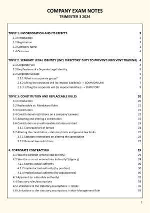The notes I used to get a HD in my Company Law exam (Trimester 3, 2024). They include topic starters as well as case summaries (which have been separated into separated segments so you know to skip if not relevant to the facts). They also contain red flags/issue spotting hints. In the sample I've included a few different sections of the notes ( not just the beginning of the notes) to give you an idea of what they look like throughout. Goodluck!
