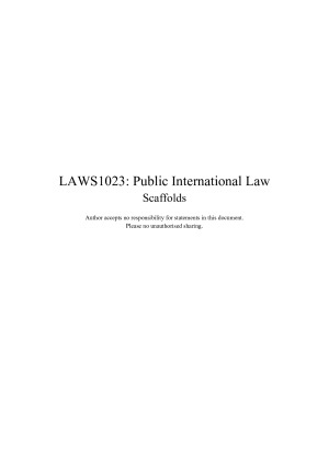High quality Public International Law (LAWS1023/LAWS5005) notes for the University of Sydney. These notes cover the substantive topics in the course (as they existed in 2024): 1. Development, Nature and Scope of International Law 2. Sources of International Law * Article 38(1) of the Statute of the International Court of Justice * Treaties * Custom * General Principles of Law * Judicial Decisions and Academic Writings * Resolutions of International Organisations * Soft Law * Codification and Development of International Law * Unilateral statements or acts 3. The Law of Treaties * Prereq: Applicability of VCLT (A) Definition of a treaty in the Vienna Convention on the Law of Treaties (B) Consent to be bound (C) Partial or modified consent to treaties (D) Legal effect of a ‘treaty’ (E) Treaty interpretation (F) Amendment (G) Invalidity of treaties (H) Termination of treaties (I) Suspension 4. International Law and Domestic Law * Domestic Law in International Law * International Law in Domestic Law 5. Personality, Statehood, Self-Determination * Statehood and International Legal Personality * Recognition * Recognition of Government * Self-Determination 6. State Title to Territory * Sovereignty over Territory * Types of Territory 7. State Jurisdiction * Jurisdiction Generally * Civil Jurisdiction * Criminal Jurisdiction Criminal: (A) Territoriality Criminal: (B) Nationality Criminal: (C) Protective security Criminal: (D) Passive personality Criminal: (E) Universality * ICC Jurisdiction 8. Immunity from Jurisdiction (Foreign State Immunity) * Gov’t entity or individual? * FS: Immunity of Foreign State Representatives (individuals) * Int’l Anomalies * FS: Gov’t corps/entities * FS: Jus Cogens * Jusde \[unclear] limited — only governments not acts where foreign State immunity * Executive Order CLT and AUS law 9. Immunity from Jurisdiction II: Diplomatic Immunity * Immunity and ICCs * Initial Wording * Problem * Individual immunity 10. State Responsibility I (1) Introduction to the State under international law, and (2) Constitutes a breach of an international obligation of the State (3) Circumstances precluding wrongfulness (4) Standing: Entitlement to invoke responsibility of another State (5) Consequences of Conduct: Entitlement of reparations 11. State Responsibility II (Diplomatic Protection) * Breach of Standard of treatment (mistreatment) * Discretion of State to use Diplomatic Protection * Requirement of Nationality of Claim * Exhaustion of Local Remedies 12. Use of Force * Tiering of severity * Principle of Non-Intervention * Threat or Use of Force * Exception 1: Self-Defence * Exception 2: Collective Security (UN Security Council) * Other Justifications * Just War Theory * History * Case Study: 2003 Invasion of Iraq * Implementation, Enforcement, Accountability * Problem/Question * Generally * Methods of dispute resolution * International Court of Justice