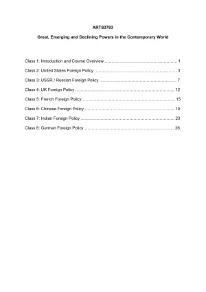 I used these notes to achieve a mark of 93 (High Distinction) in Great, Emerging and Declining Powers in the Contemporary World (ARTS3783). Comprehensive and detailed notes on all readings for the course. Extremely useful for the multiple choice quizzes as well as the policy paper. Up to date and covers all topics in the course, including: - Introduction and Course Overview - United States Foreign Policy - USSR / Russian Foreign Policy - UK Foreign Policy - French Foreign Policy - Chinese Foreign Policy - Indian Foreign Policy - German Foreign Policy