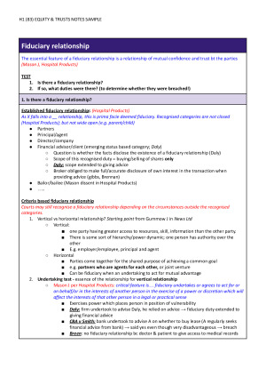 40+ pages of notes for Equity & Trusts. It includes key principles and its application to cases, structured in a way to answer hypothetical questions in exams. Contents: Fiduciary relationship Express Trusts - Quistclose trust Charitable purpose trust Trustees duties - Fiduciary obligations - Trustees' rights - Duties relating to investment Resulting trusts - Presumed - Automatic Constructive trusts - Unconscionability CT - Common intention CT - Breach of fiduciary duty Remedies - Personal - Barnes v Addy - Tracing