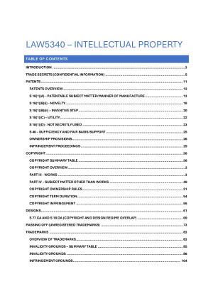 Taken in 2025 Used these notes in the exam to get an overall HD mark for the unit Includes comprehensive case summaries to make it easy to analogise/distinguish in your responses Topics covered include: -Trade secrets -Patents -Copyright -Designs -Passing off -Trade marks