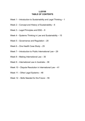 Topics: Week 1 – Introduction to Sustainability and Legal Thinking Week 2 – Concept and History of Sustainability Week 3 – Legal Principles and ESG Week 4 – Systems Thinking in Law and Sustainability Week 5 – Governance and Regulation Week 6 – One Health Case Study Week 7 – Introduction to Public International Law Week 8 – Making International Law Week 9 – International Law in Australia Week 10 – Dispute Resolution in International Law Week 11 – Other Legal Systems Week 12 – Skills Needed for the Future