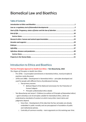 Covering all modules and readings from Biomedical Law and Bioethics. Introduction to Ethics and Bioethics Law as a regulatory tool of biomedical developments Start of life: Pregnancy, status of foetus and the law of abortion End of Life Research ethics: human and animal experimentation Genetics and eugenics Embryos Infertility Infectious diseases and pandemics Property in the Human Body