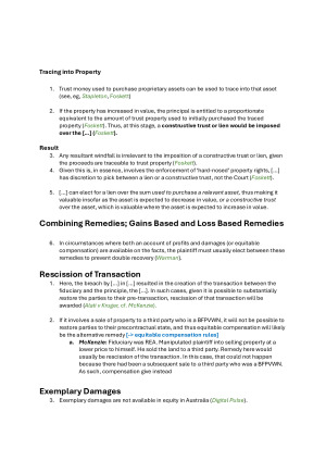 High quality exam notes for the ANU Equity Course. This contains both a (1) comprehensive note document containing full case summaries and detailed analysis of the law, and (2) a summarised exam version to help answer problem questions. The first few pages of the sample demonstrate the exam-summarised notes. The following view pages illustrate the comprehensive notes document. - Assignment - Fiduciary Duties - Express Trusts - For person or purpose trusts - Non Charitable Trusts - Charitable Purpose - Administration of trusts - Trust Duties - Remedies - Third-Party Liability - Resulting Trust Every topic is summarised and engaged with in-depth. Relevant cases have been included with only the relevant facts needed to analogise or disanalogise in an exam. Provided in a well organised document that is easy to navigate and structured in a clear and logical form for an exam.