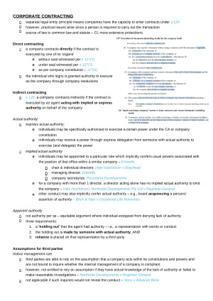 Comprehensive Final Exam notes for Corporate Law - Sem 1 2025!!!!!!!! Everything you need to know for your corporate law final exam - I used these to get a 7 overall in the course + CONCISE & NEAT - good to bring into exam + authorities colour coded - cases and legislation + clear headings and subheadings + relevant cases broken down (facts + decision) + relevant legislation inserted and highlighted Topics: 1. INTERNAL STRUCTURE AND MEMBERSHIP 2. CORPORATE CONTRACTING 3. DIRECTORS’ DUTIES (3 duties + enforcing) 4. MINORITY PROTECTION 5. CORPORATE DISCLOSURE 6. CORPORATE FINANCE 7. EXTERNAL ADMINISTRATION