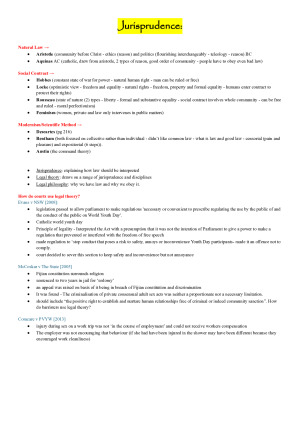 High Distinction Full Course Jurisprudence Notes!! Jurisprudence Notes: Table of Contents - Introduction to Jurisprudence - Natural Law Theory (including Aristotle & St Thomas Aquinas) - Social Contract Theories, Natural Rights & Liberalism (including Kant, Hobbes, Locke & Rousseau) - Enlightenment Feminism - Modernism: Law and the Scientific Method (including Descartes, Hume, Bentham & Austin) These notes explore fundamental legal theories that explain how law is interpreted, why it exists, and why it is obeyed. They cover ancient Natural Law concepts of reason, community, and moral guidance for 'good' law, exemplified by Aristotle's teleology and Aquinas's classifications of law and views on obedience to unjust laws. The notes then delve into Social Contract Theories and Liberalism, examining how individuals relate to the state, the assertion of natural rights (life, liberty, property), and the justification of governmental power, as articulated by Hobbes, Locke, and Rousseau, alongside Kant's ideas of human dignity. Enlightenment Feminism is also discussed, offering critiques of traditional social contracts and advocating for universal rights and equality. Finally, the notes cover Modernism, detailing the shift towards rational, analytical, and objective approaches to law, leading to Legal Positivism through thinkers like Descartes, Hume, Bentham (Utilitarianism, command theory, codification), and Austin (command theory, sovereign power). This collection provides an integrated understanding of the historical and philosophical underpinnings of law and its societal function.