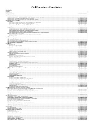High Distinction Civil Procedure Full Course Notes. These notes are in step-by-step format for every possible question in the final exam, covering all content learned throughout the course length. Table of Contents - Introduction to Civil Procedure: Defining procedural law, its purposes, and main authorities (CPA, UCPR). - Case Management & Guiding Principles: Overriding purpose (just, quick, cheap resolution), objects of case management, dictates of justice, elimination of delay, and proportionality of costs, including court directions and case types/divisions. - Before Commencing Action: Jurisdiction (inherent, implied), limitation periods for various actions (contract, tort, personal injury, defamation, etc.), and preliminary steps like preliminary discovery. - Preliminary Discovery: Orders for identity/whereabouts (r UCPR), equitable alternatives for innocent third parties, and discovery to decide whether to commence proceedings against a prospective defendant (r UCPR) or from a non-party (r UCPR). - Joining Parties in Proceedings: Principles of joinder for plaintiffs and defendants (as of right or with court leave), considerations for granting leave, and procedures for amending originating processes, including setting aside joinder. - Joining Causes of Action: Rules for joining multiple causes of action (as of right or with leave) at different stages of proceedings. - Miscellaneous Joinder Provisions: Court's power to join or remove parties, joinder on application of a third party, and consolidation of proceedings. - Commencing Proceedings: Determining the correct originating process (Statement of Claim or Summons), filing procedures, required information in the originating process, and consequences of commencing with the wrong process. - Service of Documents: Personal service in NSW (on individuals and companies), interstate service (SEPA application), overseas service (Hague Convention and non-Convention countries), objecting to service, and substituted service. - Stale Originating Process: Validity period, consequences of stale service (appearance vs. non-appearance), and procedures for setting aside stale processes or extending time for service. - Pleadings & Particulars: Defence requirements, plaintiff's reply, subsequent pleadings, content and form of pleadings, specific particularisation rules (fraud, negligence, damages), and procedures for striking out or amending pleadings. - Appearance & Cross Claims: How to enter an appearance, time limits, effects of appearance (waiver of objection), withdrawal of appearance, right to cross-claim (against plaintiff, other parties), time limits, and procedures for cross-claims. - Obtaining Evidence (Pre-Trial): Notices to Produce (compelling documents from other parties), Discovery (court-ordered production from other parties), Interrogatories (questions to other parties), and Subpoenas (obtaining evidence from third parties). - Adjournments: Court's power to adjourn proceedings and relevant considerations guided by the CPA and UCPR. - Concluding Proceedings (Summary Disposal): - Default Judgment: Obtaining judgment when the defendant fails to file a defence (for unliquidated and liquidated claims), and procedures for setting aside default judgments. - Summary Judgment: Plaintiff seeking judgment when a defence has been filed but is deemed to have no real prospect of success. - Summary Dismissal: Defendant seeking to dismiss or stay proceedings due to no reasonable cause of action, frivolous/vexatious claims, or abuse of process. - Dismissal for Non-Appearance or Want of Prosecution: Dismissal due to plaintiff's non-appearance or lack of due despatch by either party. - Offers of Compromise & Calderbank Offers: Rules for making and accepting UCPR offers of compromise, their cost consequences (ordinary vs. indemnity costs), and the alternative of Calderbank offers. - Consent Orders & Settlements: Court's power to record settlements as consent orders and jurisdiction over questions of compromise. - Universal Principles: Tutors and legal incapacity, common law principles affecting procedure (estoppel doctrines: res judicata, issue estoppel, Anshun estoppel, privity), and general principles applying to the CPA and UCPR (overriding purpose, case management objects, time extensions, elimination of delay, dictates of justice, dispensing powers, discretion of the court, procedural irregularities, and general principles for notices of motion and affidavits). These comprehensive Civil Procedure notes provide an in-depth examination of the rules and principles governing civil litigation in New South Wales, primarily under the Civil Procedure Act 2005 (CPA) and Uniform Civil Procedure Rules 2005 (UCPR). They systematically cover the lifecycle of a civil dispute, from understanding jurisdictional requirements and pre-action preliminary discovery to commencing proceedings, managing parties and causes of action through joinder and amendment, and the critical aspects of service. The notes extensively detail the processes for pleadings, obtaining evidence via notices to produce, discovery, interrogatories, and subpoenas. Furthermore, they outline various methods for concluding proceedings, including default judgment, summary judgment, summary dismissal, and offers of compromise, alongside the foundational overriding purpose and case management principles that underpin procedural fairness and efficiency in the administration of justice. The inclusion of relevant case law throughout provides practical context and interpretation of the rules.