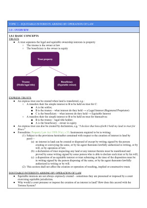 Detailed notes including all relevant case law (pink) and legislative provisions (green) to assist you in preparing for your Prop B assessments and exam!! Good luck <3 Includes • detailed notes (blue table) on the basic concepts and fundamental principles of Property Law • step by step instructions for the more complex topics such mortgages, fraud as an exception to indefeasibility and priority disputes Topic list 1. Equitable interests arising by operation of law 2. Co-ownership 3. Mortgages 4. Enforceability of proprietary interests, Title, Torrens System and conveyancing 5. The principle of Indefeasibility of Title 6. Exceptions to Indefeasibility of Title 7. Unregistered (equitable) interests under Torrens System