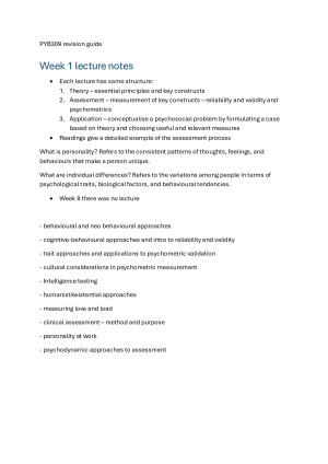These notes are what I used for my final exam to receive a 6. Notes are compiled from lectures, tutorials and extensive research. They are a concise guide that covers top relevant concepts to ace the exam. - behavioural and neo behavioural approaches - cognitive-behavioural approaches and intro to reliability and validity - trait approaches and applications to psychometric validation - cultural considerations in psychometric measurement - Intelligence testing - humanist/existential approaches - measuring love and load - clinical assessment – method and purpose - personality at work - psychodynamic approaches to assessment Boost your exam prep with these concise, easy-to-follow notes perfect for last-minute revision or dedicated students looking to excel!