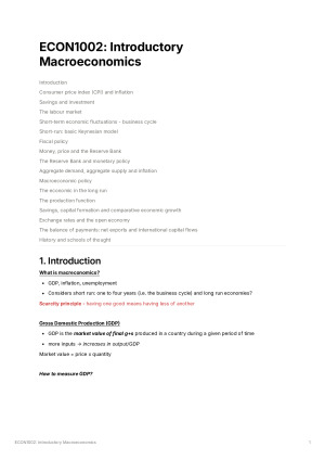 Detailed and perfectly formatted notes based on lecture slides, readings and key outcomes from tutorial questions. These notes helped me get a mark of 91 and close to perfect score on midsem (34/35). Covers topics below: - Introduction - Consumer price index (CPI) and inflation - Savings and investment - The labour market - Short-term economic fluctuations - business cycle - Short-run: basic Keynesian model - Fiscal policy - Money, price and the Reserve Bank - The Reserve Bank and monetary policy - Aggregate demand, aggregate supply and inflation - Macroeconomic policy - The economic in the long run - The production function - Savings, capital formation and comparative economic growth - Exchange rates and the open economy - The balance of payments: net exports and international capital flows - History and schools of thought