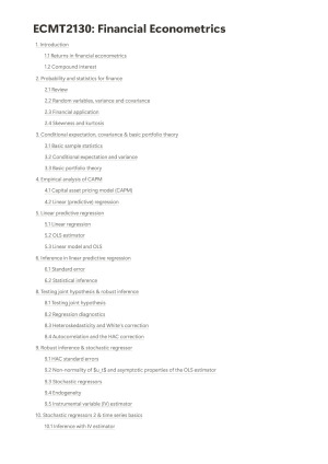 Quality concise notes sourced with information from lecture slides and key tutorial ideas. Perfectly formatted with equations written in LaTeX. Includes bonus short summary of assumptions and tests carried out (and their purposes). Covers topics below: 1. Introduction (returns & compound interest) 2. Probability and statistics for finance 3. Conditional expectation, covariance & basic portfolio theory 4. Empirical analysis of CAPM 5. Linear predictive regression 6. Inference in linear predictive regression 7. (midsem week) - no lecture 8. Testing joint hypothesis & robust inference 9. Robust inference & stochastic regressor 10. Stochastic regressors 2 & time series basics 11. Time series prediction and inference 12. Other topics on financial econometrics (volatility models, VaR)