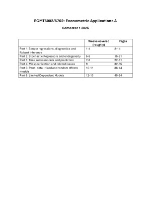 These notes explain all course content from ECMT6002/6702, which I studied in Semester 1 2025. Part 1: Simple regressions, diagnostics and robust inference Part 2: Stochastic Regressors and endogeneity Part 3: Time series models and prediction Part 4: Misspecification and related issues Part 5: Panel data - fixed and random effects models Part 5: Limited Dependent Models