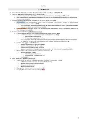 Evidence scaffolds i made by consolidating notes from lectures, past students, textbook readings and online summaries. They are set out clearly, enabling ease of answering problem questions. I used these in the exams and scored 85. Topics covered: - Introduction to Evidence Law - Proof I (Burdens and Standards) - Adducing Evidence (Witnesses, Documents and Real Evidence) - Relevance - Hearsay - Admissions and Self-Incrimination - Credibility - Tendency and Coincidence Evidence - Character of the Accused - Opinion Evidence - Identification Evidence - Discretions - Proof II (Directions)