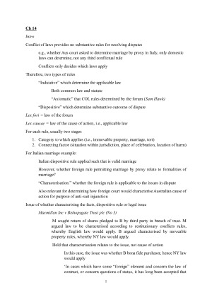 High quality and comprehensive notes based on 'Nygh's Conflict of Laws 10th Ed (2020)' and lecture slides. Includes further snippets from relevant cases and legislation. (NB includes only shortened citations, not full AGLC4). Content covered: Introduction + In Personam Jurisdiction Enforcement of Judgments at Common Law Enforcement of Judgments by Statute North American Tribal Law and Courts Choice of Law Theory, incl. Renvoi Contracts Choice of Law Torts Choice of Law Exclusion of Foreign Law and Doctrine of Depecage Cross-Vesting and Forum Non Conveniens Forum Selection Agreements Anti-Suit Injunctions and Comity Federal Jurisdiction