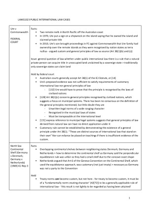 Case notes for all cases on reading guide, and additional cases from textbook. Includes facts, judgement, important dicta and quotes, and pinpoints. Super helpful for mid semester and final exam revision when behind on readings. Topics: - Sources of Public International Law - The Law of Treaties - International Law and Municipal Law - Personality, Statehood, and Self Determination - Title to Territory - State Jurisdiction - Foreign State Immunity - Diplomatic Immunity - State Responsibility - Diplomatic Protection - Use of Force - International Dispute Settlement