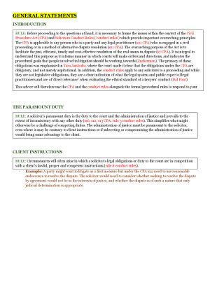Disputes and Ethics at unimelb. Covers all possible hypo situations from the 2024 exam These were my exam notes and I copied many parts from the notes straight into my exam paper, you MUST reword anything you use for your own exam in order to not be flagged for academic misconduct :) Hypo Notes: - Excessive delay or costs - Pre-litigation: initial client consideration - Alternative dispute resolution - Preliminary discovery - Determining obligation: the retainer - Commencing proceedings: defending a claim - Striking out pleadings - Abuse of process - Protecting positions until trial - Preventing cases unnecessarily going to trial - Discovery - Privilege - Lawyers engaging in illegal conduct - Class actions - Judgements, appeals and enforcement - Settlement - Costs - Solicitor-client conflict of interest - Concurrent conflict of interest - Successive conflict of interest - Confidential information