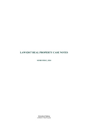 These Case Notes were made during Semester 2, 2024 and contain all the latest readings, cases and legislation. They are written in a easy to follow IRAC format which is clear and concise allowing you to quickly remember, refresh and include the cases in more depth in the mid term examination. Additionally, all the legislation has been extracted and highlighted so that you have access to it if you need to precisely know a niche point in the examination. These case notes go well with the accompanying scaffold which is separately for sale. Topics 1. Fundamentals of Land Ownership 1. Types of Property Interests 2. Old Systems Land 2. Torrens Title Land 1. Indefeasibility 2. The Register 3. Assurance Fund 4. Priorities 5. Fraud and agency 6. Rights in person-am 7. Inconsistent statutes 8. Volunteers