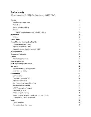 Covers entire recent syllabus in order - including summaries of cases from required reading in textbooks and lecture slides Organised table of contents links to the respective pages for ease of navigation - very important for timed exams Concise summaries of the plethora of cases covered in real property Included very helpful general advice on take-home exams at the end Contents include: - Torrens / In personam - Formalities and Common Law Priorities - Mortgages - Co-ownership - Lease - Easements - Freehold Covenants