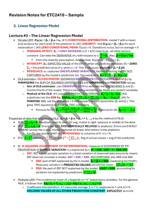 These notes for ETC2410 condense the essence of each topic, helping you identify the important examinable information. This is why the notes are few pages, and hold dense information. Key for the notes - Equations are highlighted in green - Key terms are in red text - Other important words / concepts are in purple text Topics included in the notes: 1. Introduction to Econometrics 2. Statistics Refresher 3. Linear regression 4. Hypothesis testing 5. Dummy variables 6. Functional form 7. Sample properties of the OLS estimator 8. Heteroskedasticity 9. Serial Correlation 10. Modelling dynamics 11. Large sample properties of the OLS estimator