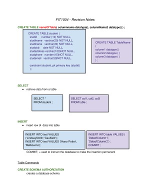 Summary of unit FIT1004. Examples of syntax and syntax templates to help students understand the content. Topics covered: - Introduction to Data Management - Relational Model - SQL Data Definition - SQL Query 1 - single and multiple tables retrieval - SQL Query 2 - aggregate function and group by clause - SQL Query 3 - subquery and Oracle function - Database Design 1 - Design Process and Conceptual Modeling - Database Design 2 - Logical Modelling - Database Design 3 - Normalisation - P1/SQL Triggers - Transaction Management and Database Maintenance - Current trends in database management