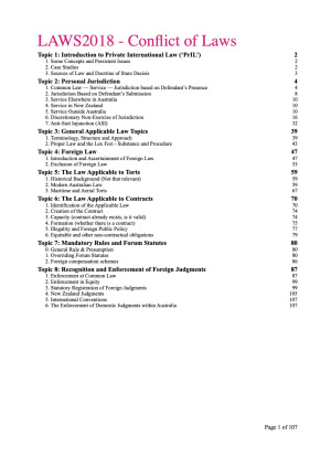 These are the ultimate Conflict of Laws notes that will provide you with order and structure in how you approach problem questions. I have produced a clear scaffold structure that is easy to read and navigate through. I have completed all the readings this semester to get the pinpoints you need that will give you the bonus marks in achieving that D/HD. Perfect for use whether from the beginning of semester (recommended!), or towards the end. Well worth the investment and saves you a lot of time and trouble from reading cases and re-watching lectures. ✓ Succinct information ✓ Comprehensive ✓ Colour-coded for easy reading Notes are also colour coded so that you can easily determine what is relevant. Light blue = key principle Pink = Cases Dark blue = legislation Red / bold = anything super key to point out Topics - Personal Jurisdiction - General Applicable Law Topics - Foreign Law - Law Applicable to Torts - Law Applicable to Contracts - Mandatory Rules and Forum Statutes - Recognition and Enforcement of Foreign Judgments
