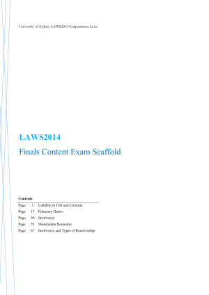 These scaffolds were made during Semester 2, 2024 and contain all the latest readings and cases. These scaffolds were used in the finals resulting in a High Distinction mark. EACH TOPIC HAS 1. Summary Scaffold (The main overriding questions to ask) 2. A Intro sentence which states what the general topic is about 3. Proper Scaffold with references (in Blue) Tips from the lecturer Topics 1. Topic 7: Liability in Tort and Criminal Law 2. Topic 8 - 10: Directors Duties 3. Topic 11: Insolvency 4. Topic 12: Minority Oppression