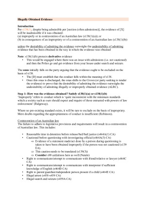 This set of detailed and structured notes are used to obtain a high HD in the Evidence Exam at Semester 1 2025 (54/60). Notes are written out in full (including introduction and conclusion), essentially acting as a template in the exam. TOPIC INCLUDED: Topic 1 - Introduction & Relevance Topic 2 - Competence & Compellability Topic 3 - Privilege Topic 4 - Examination of Witnesses Topic 5 - Character & Credibility Topic 6 - Right to Silence & Introductory Tendency & Coincidence Topic 7 - Tendency & Coincidence Topic 8 - Hearsay Topic 9 - Hearsay Exceptions Topic 10 - Admissions Topic 11 - Illegally Obtained Evidence & Opinion Evidence