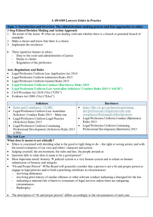 Topic 1: Introduction and Overview Topic 2: Overview of Lawyers' Responsibilities Topic 3: Civil Matters, Negotiation and ADR Topic 4: Ethical Issues in Criminal Matters Topic 5: Confidentiality and Privilege Topic 6: Lawyer Client Conflicts Topic 7: Client-Client Conflicts Topic 8: Costs and Trust Accounts Topic 9: Admission to the Profession and Renewing of Practicing Certificates Topic 11: Regulating the Profession