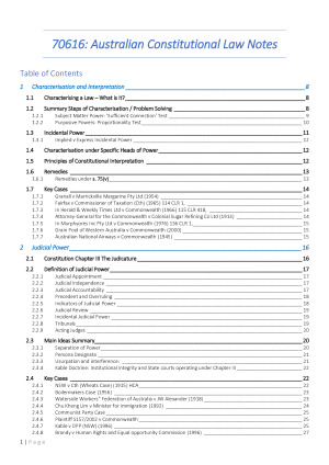 I used these notes to learn the course and scored 90%. The notes are colour coded and cross referenced and step through each section in an easy way to learn and understand the content. Topics covered include: - General Characterisation - Interpretation - Judicial Power - Heads of Power - Race Power - Trade and Commerce Power - Defence Power - External Affairs Power - Executive Spending Power - Prerogative Power - Nationhood Power - Limitations - Implied Freedom of Political Communication - Trial by Jury - Freedom of Religion - Federalism - Inconsistency between Laws - Acquisition on Just Terms