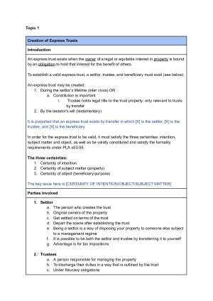 Trusts law notes covers the creation of trusts (express, resulting, constructive), different types of trusts (fixed, discretionary, charitable, purpose), the duties and powers of trustees, the rights of beneficiaries, breaches of trust and remedies, and third-party liability through knowing receipt and dishonest assistance.