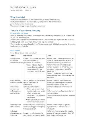 These comprehensive Equity and Trusts notes synthesise the course content for both the exam essay and hypothetical. The hypothetical notes: - are neatly organised under headings and dotpoints - contain handy case tables that include the facts, finding, reasoning and ratio - summarise the primary readings and lectures The essay notes - succinctly summarise the secondary reasonings, with a one-line summary of the author's contention and brief, pinpointed dotpoints of their key arguments - contain prompts for how to draw links or points of contrast between authors' perspectives or key ideas in the cases - are complete with a list of quotes from judgments that can be easily woven into an exam essay The notes cover all examinable topics, including: - Introduction to Equity - Fiduciary Relationships - Introduction to the Trust - Express Trusts - Quistclose Trusts - Charitable Purpose Trusts - Trustees' Duties - Resulting Trusts - Constructive Trusts - Remedies ABOUT ME: I graduated from the JD with a H1 WAM and in the top 10 of my cohort. Using these notes, I achieved a score of 86 in Equity and Trusts.