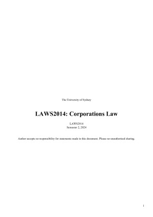 High quality Corporations law (LAWS2014/LAWS5014) notes for the University of Sydney. I used these notes to achieve a High Distinction 86 overall. These notes cover the substantive topics in the course (as they existed in 2024): 0: Formation of a company : Ways of doing business : Business Structures : Registration of Companies (Chapter 2A) : Powers of a company : Types of Companies 1: Consequences : What courts have jurisdiction : Civil and Criminal sanctions under Corporations Act : Civil Penalties : ASIC/wronged parties’ powers wrt to civil penalties : Asic powers 2A: Corporate fundraising Generally : Debt and Equity : Debt : Equity 2B: Corporate Fundraising PQ Start here! : Is the security regulated or unregulated? : Regulated Fundraising (Chapter 6D) : Unregulated Fundraising (Chapter 7) 3: Corporate Personality and Limited Liability : Separate Legal Entity and Limited Liability : Shifting Liability/veil piercing 4A: Corporate Constitution : Creation : Contents : Amending : Effect 4B: Corporate Decision Making : Separation of decision-making organs : Board of Directors : Members in a general meeting : Duomatic/unanimous assent principle (general law) : Circulating resolutions (without meetings) 5: Company Meetings : Directors’ Meetings (Board Meetings) : Members’ Meetings 5B: Directors & Officers : Directors : Officers 6: Corporate Attribution and Liability : Liability in Contract Indoor management rule : Liability in Tort : Liability in Criminal Law : Directors’ and Officers’ Duties : Duty of Care, Skill, and Diligence : Opening sentences : General law : Defences : Consequences : Duty to Act in Good Faith for the Benefit of the Company as a Whole, and for a Proper Purpose : Statute : Test (both general law and statute) : Defences : Consequences : No Conflict and No Profit Rules : Statute : Equity : Consequences : Related Party Transactions : Insolvent Trading : Test : Defences : Consequences 9: Members’ Remedies : Minority Oppression : Just and Equitable Winding Up : Statutory Derivative Action
