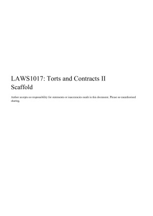 High quality Torts & Contract 2 (LAWS1017/LAWS5006) notes for the University of Sydney. I used these notes to achieve a 81/100 overall (4 marks off HD). These notes cover the substantive topics in the course (as they existed in 2023): Contents I: Introduction to Torts and Contracts II Torts and Contracts Generally Torts Contracts Concurrent liability in tort and contract Structure TORT For interference with land For interference with goods Intentional economic loss For pure economic loss CONTRACT Client wants to claim damages in contract: Client wants to rescind the contract: Bars to recession PROPORTIONATE LIABILITY FOR ECONOMIC LOSS OR PROPERTY DAMAGE Under the Civil Liability Act Under the Competition and Consumer Act T2: Trespass to Land Trespass to Land 1. Does P have title to sue 2. Does this fall within the scope of the plaintiff’s interest in land? 3. Has there been direct interference without lawful authority with the land? – Halliday v Nevill Remedies - NB Compensation for actual damage suffered Injunction Remedy of declaration Ejectment of trespasser Defences Necessity Statutory or common law authority [Statute] Statutory Action for Damage by Aircraft (1) Damage by Aircraft Act 1999 (Cth) s 9 Application of Act (1) Damage by Aircraft Act 1999 (Cth) s 10 Liability for injury, loss etc. (1) Damage by Aircraft Act 1999 (Cth) s 11 Recovery of damages without proof of intention, negligence etc. (2) CLA (NSW) T3: Private Nuisance Action on the case for unlawful interference with the use or enjoyment of land. Does the plaintiff have title to sue? What scope of the plaintiff’s interest in the use or enjoyment of land does private nuisance protect? (examples) Was it an interference amounting to an unreasonable and substantial interference with the plaintiff’s use or enjoyment of land: Munro v Southern Dairies. Basis of liability: Fault in nuisance? Defences Statutory authority Coming to the nuisance Remedies Actionable per se? Strict liability Damages (common law) Injunction Abatement T4: Tort Interference with Goods Attaining title to Sue Key idea behind appropriate title to sue ● nemodat quod non habet - you cannot give what you do not have Finding goods Bailment (giving possessions) 3 Different Torts: Interference with Goods Tort 1: Trespass - interference with goods in another’s possession Tort 2: Conversion (broader tort) Tort 3. Detinue (useful, every time you issue a fresh demand, there is a fresh title, also if negligently lost goods Reeve) Alternative: Action on the case for reversionary interest Remedies Generally Trespass to land Conversion Detinue Reversionary interest T5. Pure Economic Loss Tort of Deceit (Intentional) (Fraudulent Misrepresentation) Elements (Derry v Peek): [Generally] Negligence Duty of care Causation and scope of liability Why was the law so cautious towards purely economic loss in negligence? PEL from Negligent Misstatement Duty of care Did the defendant breach the duty of care owed the plaintiff? Did the defendant’s breach cause the pure economic loss suffered by the plaintiff? What remedies are available? PEL for Professional Negligence Generally Duty of care Breach of duty? Did the defendant’s breach cause the pure economic loss suffered by the plaintiff (see above)? Does the defendant have immunity from liability? (not examinable) Remedies PEL for Damage to Third Party Property Property damage vs PEL (Is this really PEL?) The exception to the general rule Establishing a duty of care – McHugh J in Perre v Apand See examples Breach (see above) – s5B CLA Causation (see above) – s5D CLA misstatement to third party, causing loss to P - Novel Case Injury to Third Parties (mostly not examinable) Action for injury to third party under negligence Death to Third Parties Death of a human being may not be complained of as a legal injury: Baker v Bolton. Defective Structures (NOT EXAMINABLE) Multiple Wrongdoers: Proportionate Liability Proportionate Liability for Property Damage and Economic Loss What is the correct statute/type of tort Is the D only proportionately liable under CLA (NSW) Is the D only proportionally liable under Liability under the CCA 2010 (Cth) Outside the CLA and CCA (Joint and/or several (and contribution rights)) : Loss, Causation and Remoteness Solving a Contract Damages quesiton Causation and Remoteness Is the defendant liable for loss in contract? Identify the breach(s). Does the CLA apply? CLA Applies Common Law Applies Common Law (1) Loss Common Law (2) Causation Common Law (3) Remoteness : Measure of Damages Solving an assessment of damages question Heads of Damages Generally Nominal damages Expectation damages/loss of bargain? Date of assessment Loss of chance and difficulty of assessing damages CL right to termination, effect of termination on assessment, and loss of bargain damages Reliance damages Restitutionary damages Reinstatement costs Injured feelings, disappointment, or distress Reasons to reduce the damage Contributory negligence Apportionment CLA Mitigation - always tested - always says Particular issues (Consider!) P must prove extent of the breach: Commonwealth v Amann Aviation Pty Ltd (1991) 174 CLR 64, 80, 99, 137 Effect of taxation Late payment of money : Sums Fixed by Contract Solving a sums fixed by contract problem question General Principles Identify the relevant agreed damages clause Unconditionally accrued vs conditionally accrued Damages or debt due Liquidated damages clause or penalty - if you go for damages : Recission Solving a rescission problem Vitiating factors Pre-contractual conduct that undermines (vitiates) the consent of a party to a contract. Consequences: Rescission Generally What is Rescission Expressing rescission Bars to Rescission (consider after establishing VF) Factual bar to rescission ● Restitution impossible Affirmation (“defence” to rescission) (better described as a bar to rescission) Third parties Rule in Seddon’s case 12: Mistake Solving a mistake problem