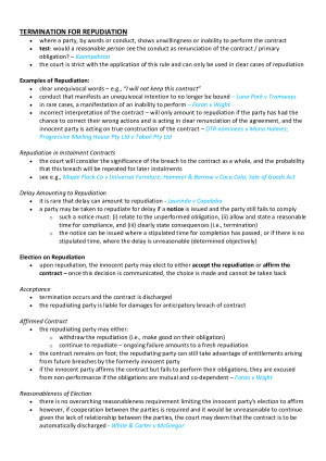 Comprehensive Final Exam notes for Contracts II - Principles of Contractual Liability !!!!!!!!! Everything you need to know for your contracts II final exam I used these to get a 7/High Distinction in the course + CONCISE - good to bring into exam + very clear headings and formatting + cases and legislation colour coded for easy reference in exam + all relevant cases broken down (facts + decision) + main takeaways from each case Topics, updated for 2025: • Discharge by Performance & the Doctrine of Substantial Performance • Termination for Serious Breach • Termination for Repudiation • Effects of Termination • Remedies 1: Specific Relief • Remedies 2: Damages • Vitiating Factors: o Misrepresentation at CL o Statutory Misleading or Deceptive Conduct o Duress o Undue Influence o Unconscionability o 3rd Party Impropriety • Rescission and Remedies for Vitiating Factors