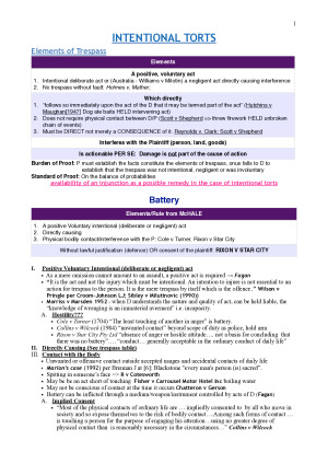 Notes from Semester 2, 2024. These notes cover all weekly and self-learning modules. They provide a detailed scaffold for all topics to be used in the exam, cutting down your studying time and time spent in the exam. All key cases are cited. I scored a HD & first in course using these notes to learn the course. Topics covered include: Intentional Torts 1. Battery 2. Assault 3. False Imprisonment 4. Trespass to Land 5. Action on the Case 6. Public and Private Nuisance 7. Defences Topics - Tort of Negligence 1. Duty of Care 2. Breach 3. Causation 4. Remoteness 5. Defences 6. Wrongful Birth/ Life 7. Mental Harm 8. Pure Economic Loss 9. Vicarious Liability 10. Non-Delegable Duties 11. Concurrent and Proportionate Liability 12. Death Claims 13. Statutory Authorities