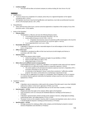 Contents (from the Table of Contents): - Introduction & Partnership. - Constitutional & Regulatory Framework; Types of Companies; Corporate Personality & Separate Legal Entity. - Incorporation & Corporate Constitution (Promoters; Pre-registration contracts). - External Relations — Contracts & Tort; Direct Execution; Agents (Actual & Apparent Authority); Indoor Management Rule (common law & statutory); Assumptions. - Company Finance — Share Capital & Debt: Fundraising, Disclosure Documents, CSF; Corporate Finance; Debt Finance (Debentures; PPSA); Equity Finance; Dividends; Reductions; Buy-backs; Financial Assistance. - Corporate Constitution. - Directors’ Duties (care/diligence; conflicts; improper use; misuse of information s183; material personal interest s191; insolvent trading; consequences). - Membership & Members’ Remedies (oppression; derivative action; winding up s461; other remedies). - Financial Difficulties & Winding Up: Insolvency; External Administration; Restructuring (Part ); Voluntary Administration; Liquidation & Simplified process; Receivership; Schemes of Arrangement.