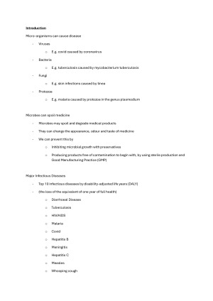 Covers every topic needed for PHAR2921 in line with all learning objectives, ready for the final exam! Topic List Introduction Medically Important Bacteria – Gram Negative Medically Important Bacteria – Gram Positive Medically Important Viruses- Fungi Physical Sterilisation Chemical Antimicrobial Agents Contamination Control and Cleanroom Technology Antibiotics Hepatitis Antivirals HIV Antivirals Vaginal Thrush Gastrointestinal Infections Antibacterials Antiparasitics Antifungals Sexually Transmitted Infections Travel Health Antimicrobial Stewardship Practice Points on Antimicrobials Antimicrobial Use in Indigenous Australians Pharmacokinetic and Pharmacodynamic Considerations of Antibiotics