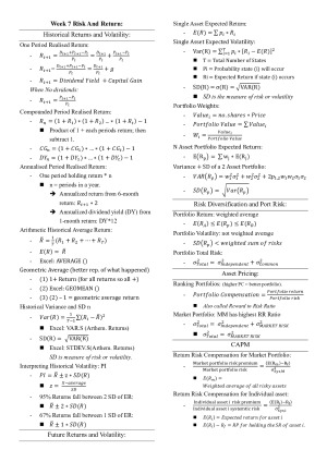 This HD-level formula sheet, prepared by a Dean’s List student, includes the key theories, formulas, and applications you need for the final exam in FINS2615 making revision sharper, faster, and exam-ready! Contents Week 7 focuses on risk and return. Week 8 examines the cost of capital. Week 9 explores capital structure decisions. Week 10 discusses payout policy