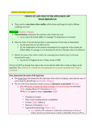 These scaffolds are all you need under exam conditions! They step through each examinable topic, approach to answering a problem question and include key case references and principles. They are truly a one-stop shop and helped me score 79/100! The topics covered include: * General applicable topics * Choice of law in tort * Choice of law in contract * Mandatory rules and the law of the forum * Substance and procedure * Proof of foreign law * Exclusionary doctrines * Personal jurisdiction * Discretionary non-exercise of jurisdiction (including in Trans-Tasman proceedings) * Anti-suit injunctions * Recognition and enforcement of foreign judgments (common law and statute) * Exclusionary doctrines