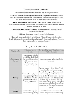 Contains the following: 1. Principles of tort law 2. Trespass to the person 3. Trespass to Land 4. Torts relating to goods 5. Defences to intentional torts 6. Nuisance (Private and Public) 7. Economic Torts 8. Economic Torts continued 9. Defamation 10. Defences to Defamation 11. Remedies 12. Statutory Rules cheat sheet 13. Cheat sheet on how to identify tort from facts 14. Case summaries cheat sheet