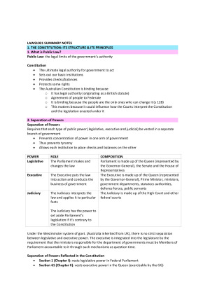 Clean, Organised, Well structured Notes. Topic 1 – Introduction and History of Australian Constitutions Topic 2 – Legislative power Topic 3 – Constitutional change Topic 4 - Public Law and First Nations Topic 5 - Right to vote Topic 6 - Eligibility of parliamentarians Topic 7 - The executive and responsible government Topic 8 – Executive power, Delegated legislative Topic 9 – Non-statutory executive power: prerogatives and capacities / Nationhood power / Executive detention case study Topic 10 - Overview of Chapter III; Judicial Power Topic 11 - Separation of judicial power Topic 12 ‘off-court’ roles for judges; practice problems and discussion Topic 13 - Separated Judicial Power in Context – statutory interpretation and principle of legality Topic 14 - Separated Judicial Power in Context - punishment