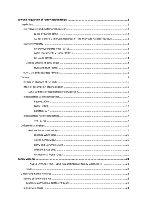 Detailed notes & scaffolds I used to learn the family law course. I used these notes & came first and received a HD in 2024. Success in the Family Law exams depends on your ability to extensively elaborate based on the facts present. These executive-level notes will allow you to run through topics quickly and efficiently find the relevant principles, leaving you with more time to write a thoughtful and detailed HD answer. Success in the Family Law exams depends on your ability to extensively elaborate based on the facts present. These executive-level notes will allow you to run through topics quickly and efficiently find the relevant principles, leaving you with more time to write a thoughtful and detailed HD answer. Topics: 1. Marriage, De Facto Relationships, and Divorce 2. Family Violence 3. Dispute Resolution 4. Family Lawyers and Ethics 5. Parenting 6. Child Support and Child Maintenance 7. Private Ordering of Property 8. Property 9. Spousal Maintenance