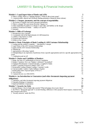 Highly detailed and well-structured notes. Ideal for the short answer / multiple choice final exam assessment structure and the problem question assessment. Includes theory points for the optional essay. These notes are up to date for 2024, incorporate all modules and the updated structure of the sub-topics. I RANKED 1st in this unit of study. These are the notes I made to get there. Topics: 1. Legal supervision of banks and ADIs 2. Cheques, payments and the concept of negotiability 3. Basic principles of bank lending, and the ADI/customer relationship 4. Duties & liabilities of banks and ADIs 5. An introduction to guarantees, and other documents imposing payment obligations 6. Security for debt (PPSA) 7. Bills of exchange